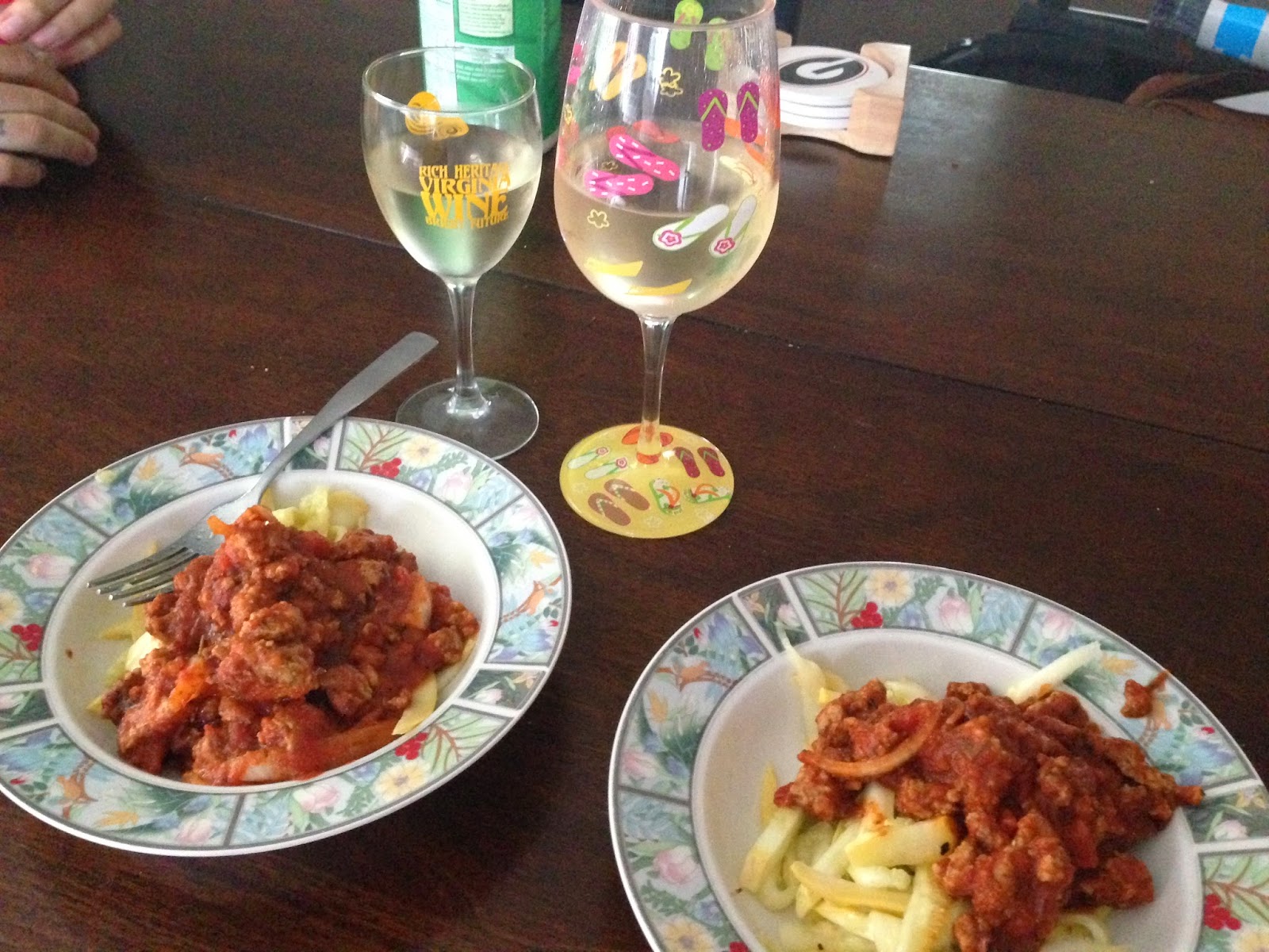 My friend Maggie brought me squash from her mom's garden so we had squoodles and some delicious meat sauce (recipe coming soon). Note Harrison's awkward hands in the corner.